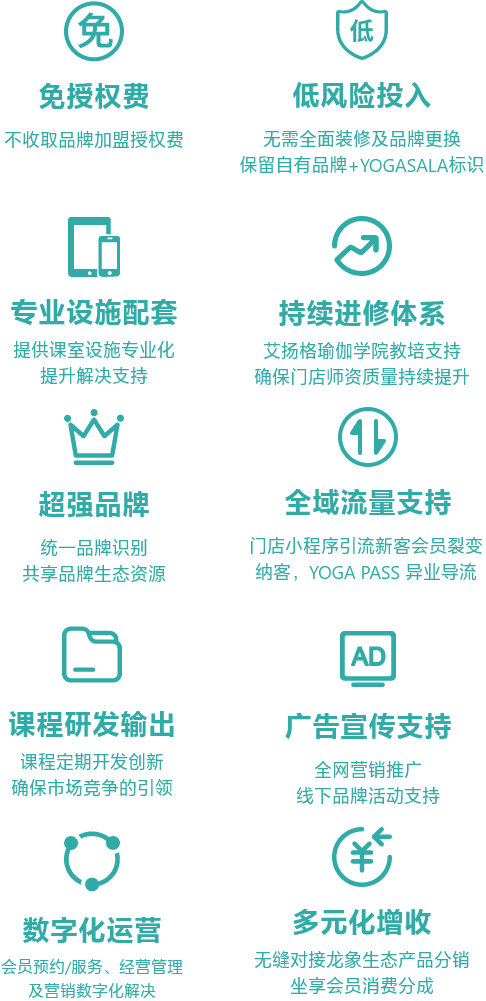 YOGASALA品牌联盟作为新兴国民瑜伽连锁品牌,以瑜伽+互联网创新为驱动力,整合集团资源,构建YOGASALA品牌联盟共享生态体。与众多知名企业及兄弟品牌进行市场商务、跨界营销和企业瑜伽等多种合作形式,为加入品牌联盟合作的连锁场馆提供全方位的发展扶持。